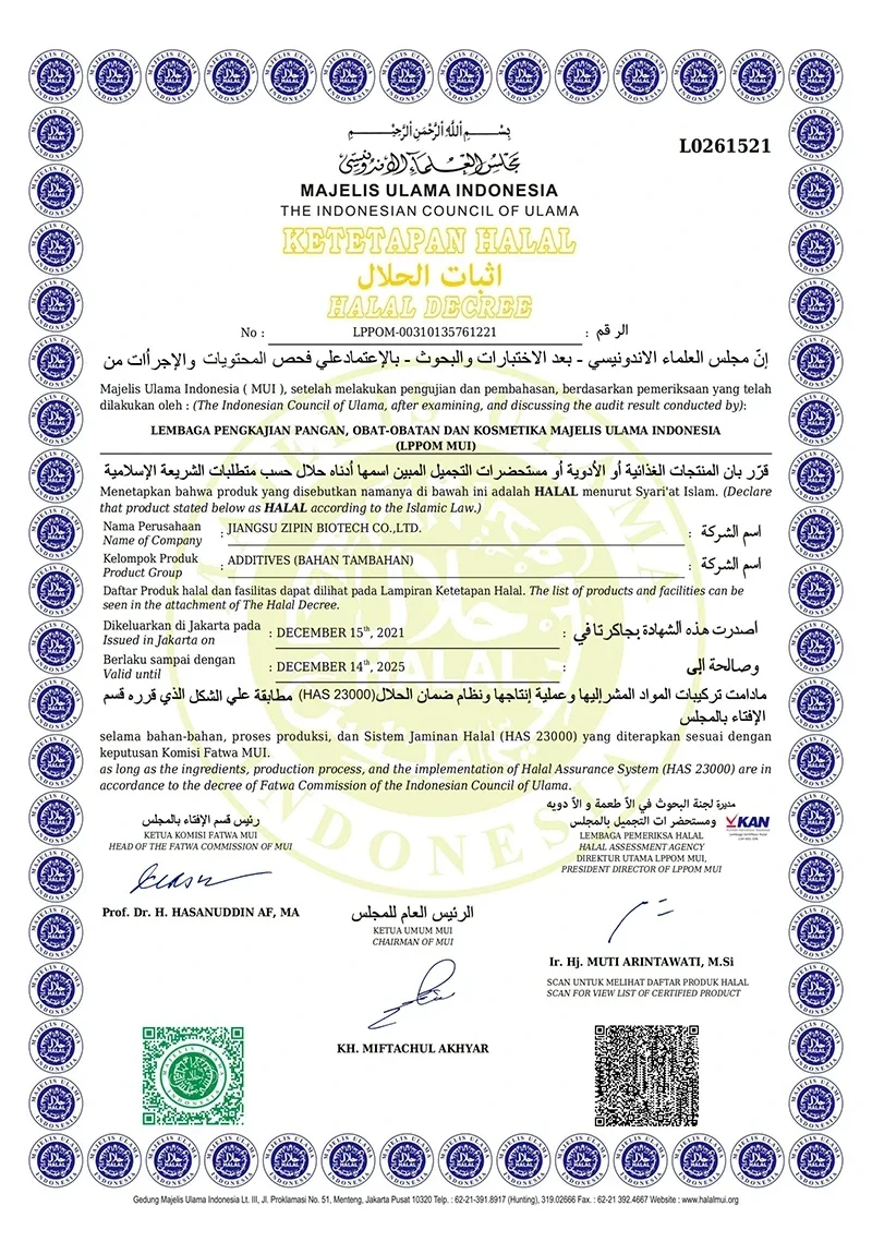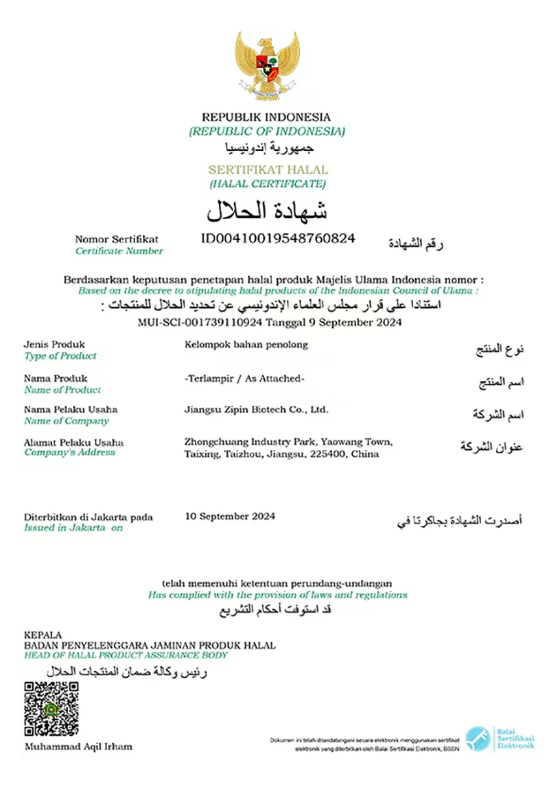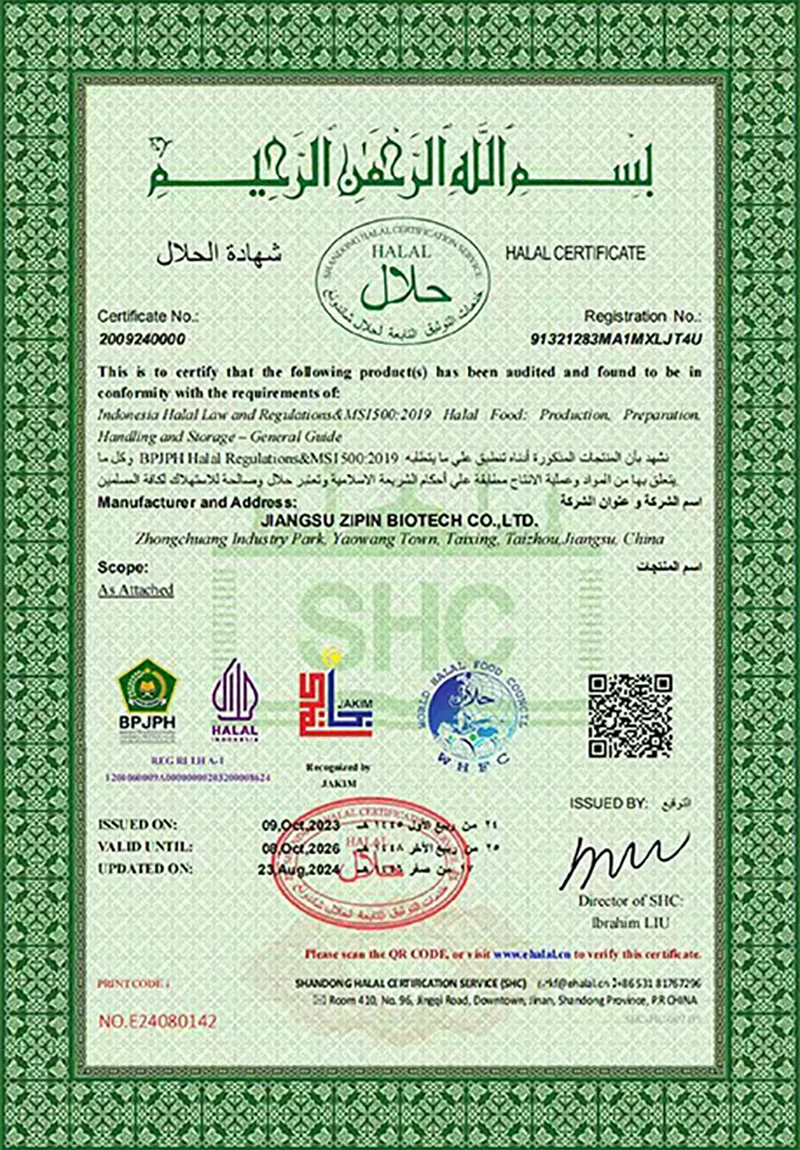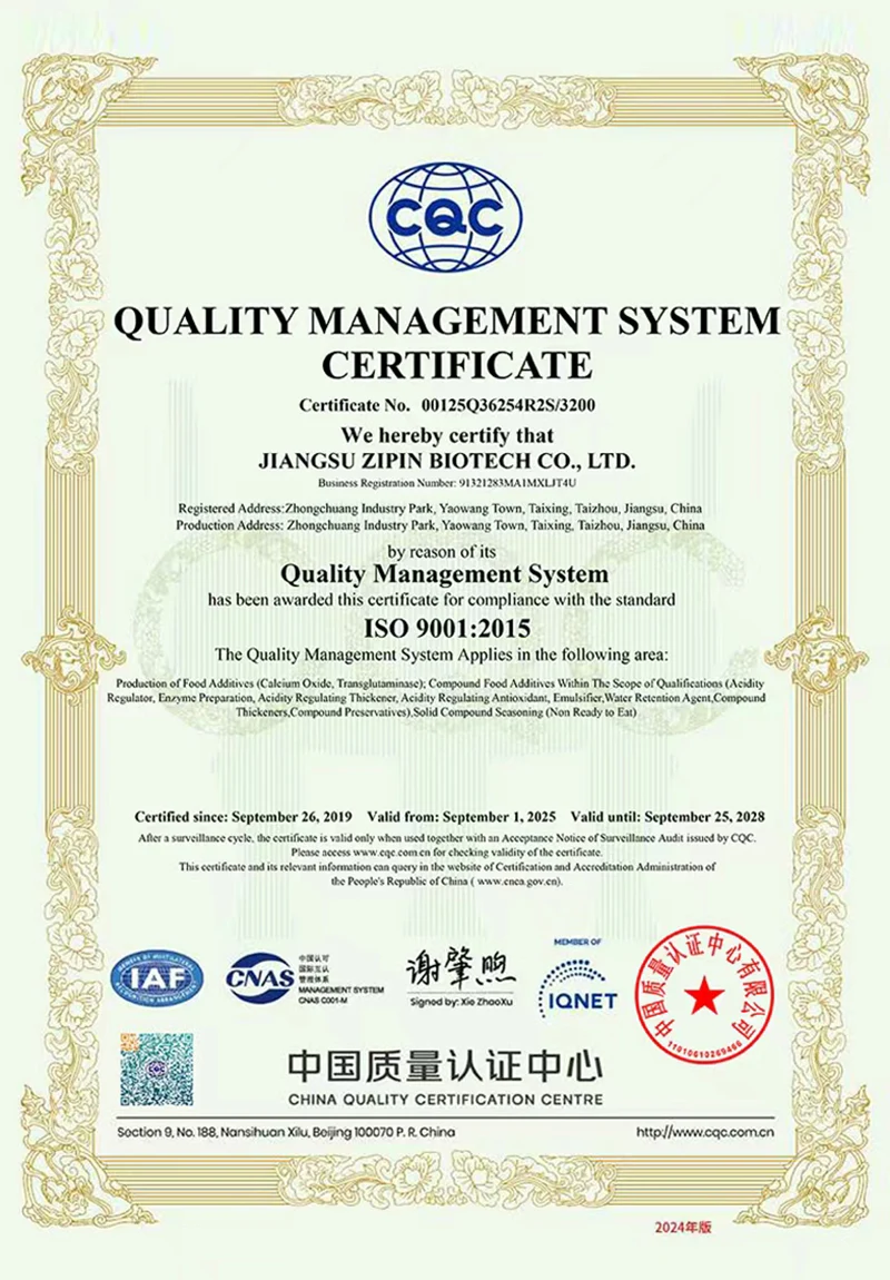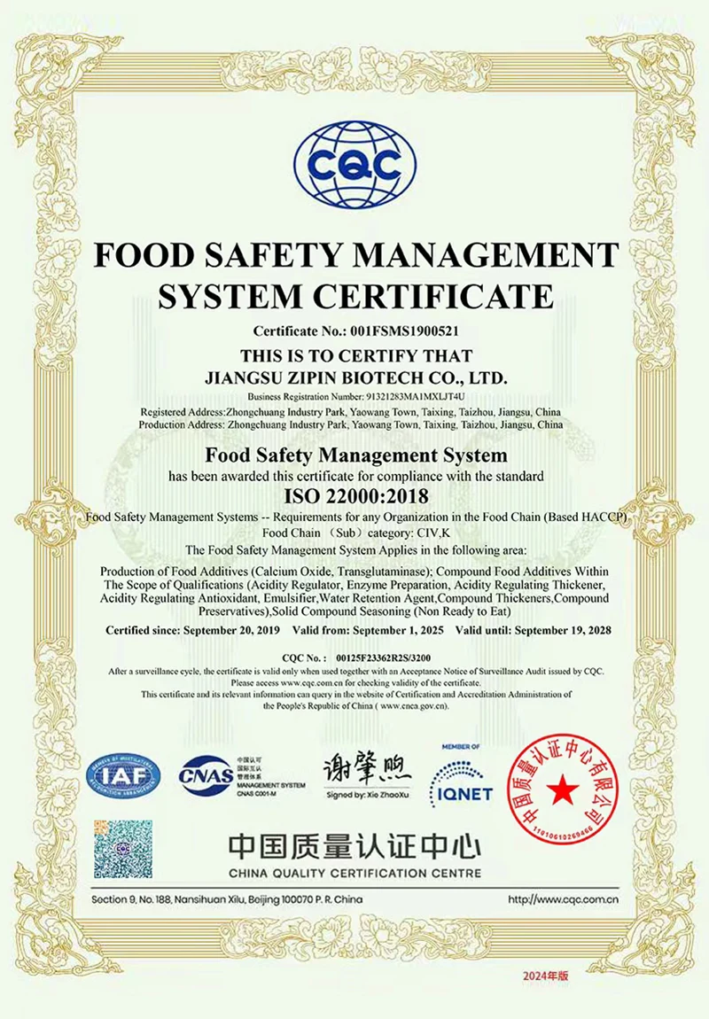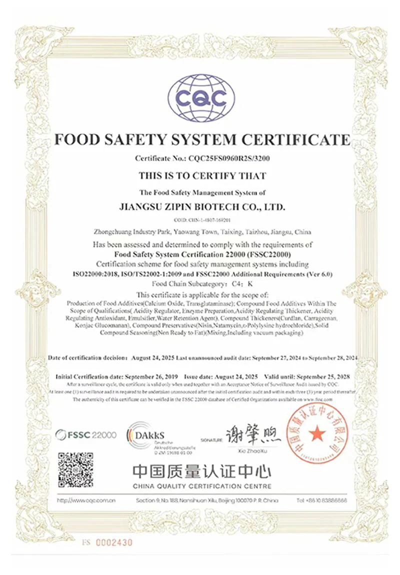 Jiangsu Zipin Biotech Co., Ltd. була створена в 2016 році, займаючи площу 20 000㎡. Як сучасне приватне підприємство, ми зараз в основному займаємося дослідженнями та розробками, виробництвом і продажем харчових добавок. Наша основна продукціяТрансглутаміназа, Курдлан, ε-полілізин, Нізин, Натаміцин та інші харчові добавки.